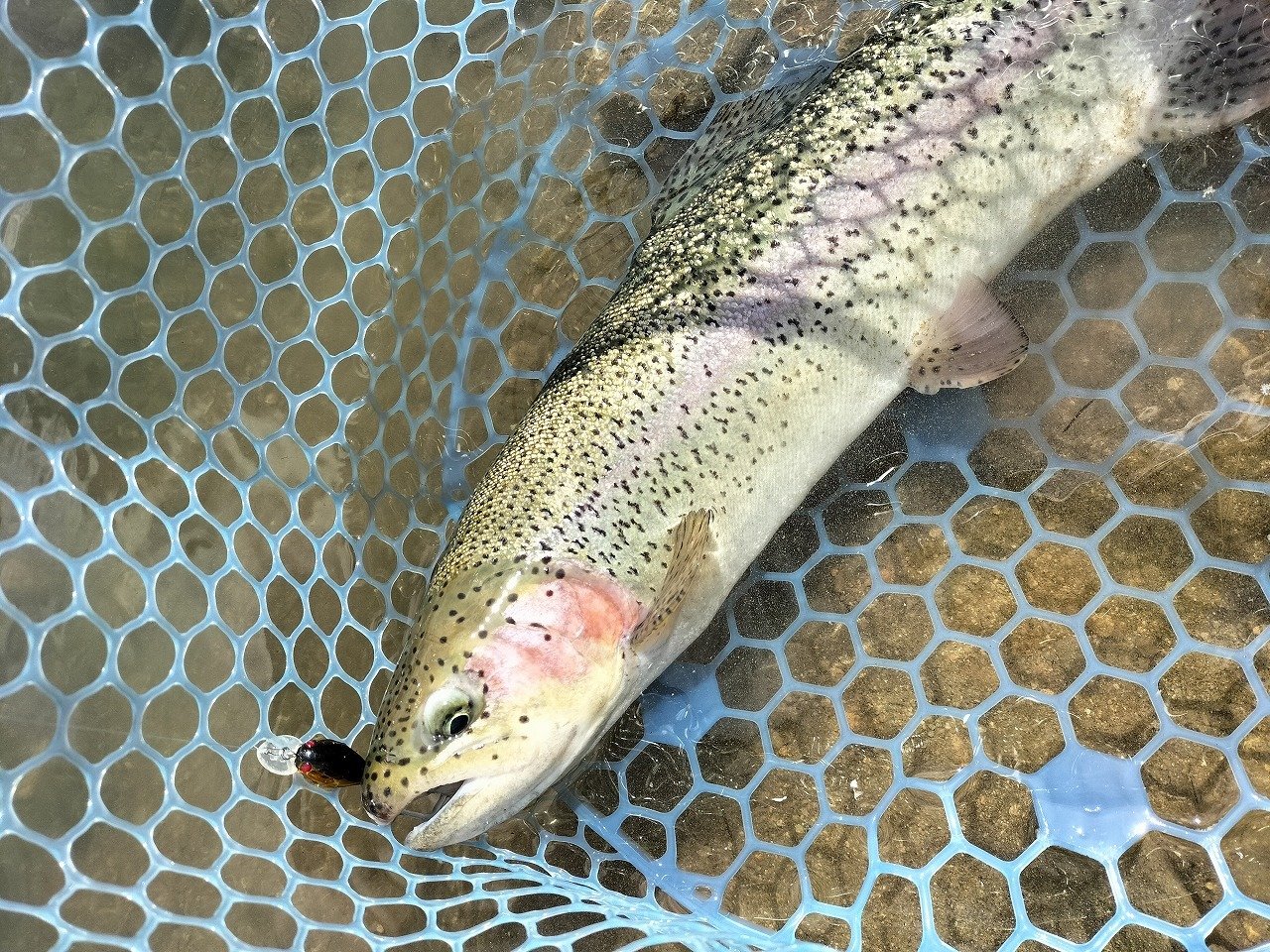 この日は日中の気温が急激に上がったため、魚の活性が今一つと、施設の方の説明があり心配していました。また日中での適正リトリーブスピードのチェックができておらず不安でしたが、新製品のRSドリフトスピン1.3g、正味1時間ほどの釣りで結果を出してくれました。スタッフ大沼が自信を持っておすすめします。