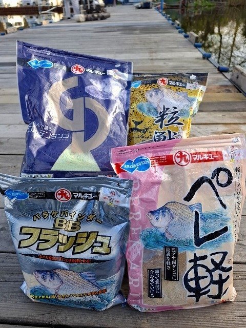 ■釣り方:バランスの底釣り(タナ50CM) ■竿:がまかつ がまへら 天輝 9尺 ■浮子:sid.5 customfloat.BM(J-YGT 赤荻作) ■道糸:東レ 将鱗スーパー50 1.5号 ■ハリス:㊤:東レ 将鱗へら TYPE-Ⅱ ハリス 0.8号/27CM ㊦:東レ 将鱗へら TYPE-Ⅱ ハリス 0.8号/35CM ■ハリ:㊤:がまかつ アスカ 11号 ㊦:がまかつ アスカ 10号 ■エサ:《ダンゴ》マルキユー ダンゴの底釣り芯華150+ダンゴの底釣り冬50+水110 を混ぜ合わせ固まったら軽くホグして基エサ完成。 手水で開き具合を調整しエサの大きさはパチンコ玉大サイズ。 《グルテン》マルキユー もちグル60+わたグル40+水110 をグルテン専用混ぜ棒で粉の状態で良く混ぜ合わせる。 水を入れたらグルテン専用混ぜ棒で同じ様に満遍なくしっかりと混ぜ合わせる。 その後数分放置し固まったらグルテン専用混ぜ棒でエアーを入れる様にホグして基エサ完成。 手水で開き具合を調整しエサの大きさはパチンコ玉大サイズ。 その他、ダンゴ/グルテンを1:1で混ぜ合わせたグルダンゴも使用。