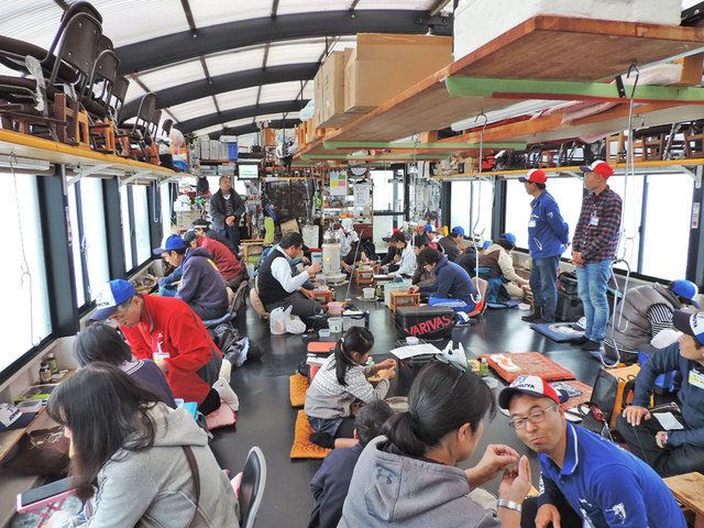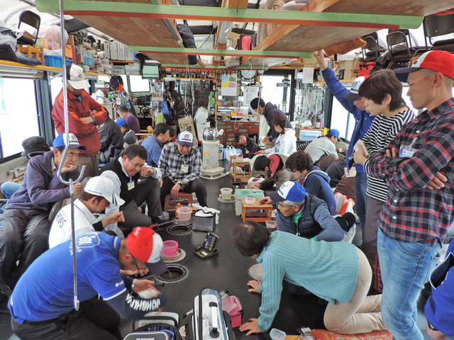 こちらが例年お世話になっているドーム船(山中湖、湖明荘ドーム船)内部の様子。板の間に座布団、ストーブの効いた暖かい船内で、この先冷え込みが厳しくなっても船内では快適に釣りを楽しむことが出来ます。近年、こうしたドーム船でのワカサギ釣りが各地で大人気!今回のイベントも募集開始早々に満員御礼となり、船内も賑やかにイベントスタートとなりました!