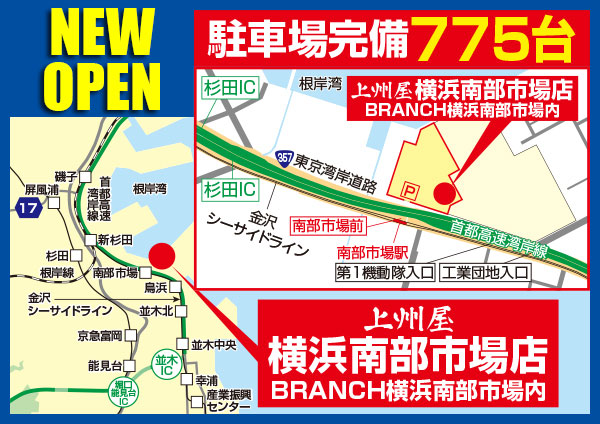 施設駐車場775台!金沢シーサイドライン「南部市場駅」目の前!BASS、ソルトなどルアー用品地域最大級!上州屋横浜南部市場店は抜群の品揃えとアクセスの良さで、皆様のフィッシングライフを徹底応援します!