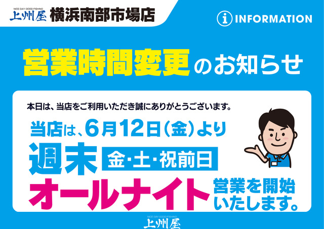 釣行前のお買い物が便利に!6月12日(金)より週末(金曜日・土曜日・祝前日)はオールナイト営業いたします!
