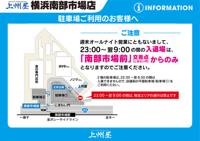 ご注意下さい※23:00~翌9:00の間の入退場は「南部市場前」交差点(にぎわい門)からのみとなります。※建物2階駐車場は22:30~翌8:30の間は入庫できません、店舗前の平面駐車場をご利用下さい。※23:00~翌9:00の間は、物流エリアの通行が出来ません(通行禁止)。