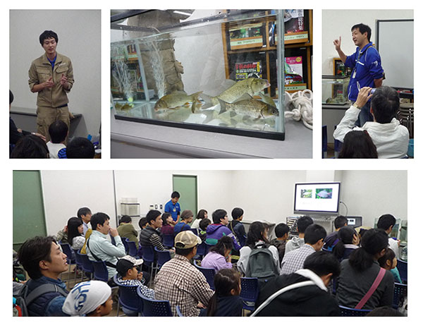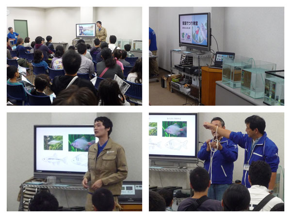 生物園スタッフの方からは、公園内に生息する魚の種類や生態についてレクチャーいただき、上州屋スタッフからは使用する釣り道具の種類や用途、糸の結び方などを説明させて頂きました。