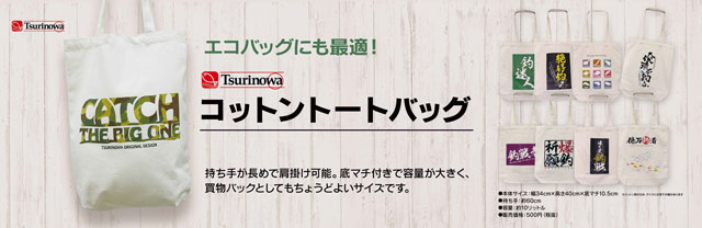 エコバックにも最適!上州屋オリジナルTsurinowaコットントートバックを7月上旬より各店にて販売します。持ち手が長めで肩掛け可能。底マチ付きで容量が大きく、買物バックとしても丁度よいサイズです。