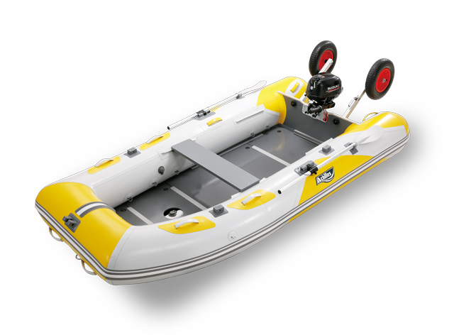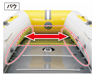 ボート前方の甲板幅が通常より広く、クーラーボックス等の荷物がおきやすい。旧モデルに対しチューブ径を10mm細くすることで、より甲板内がワイドになり、スポーティな走りも実現しました。