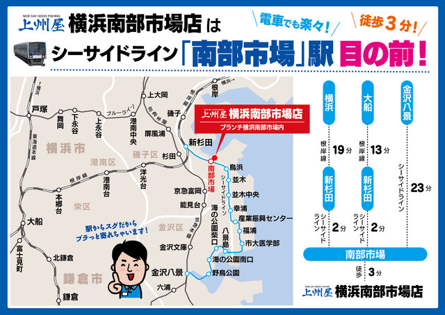 施設駐車場775台!金沢シーサイドライン「南部市場駅」目の前!BASS、ソルトなどルアー用品地域最大級!上州屋横浜南部市場店は抜群の品揃えとアクセスの良さで、皆様のフィッシングライフを徹底応援します!