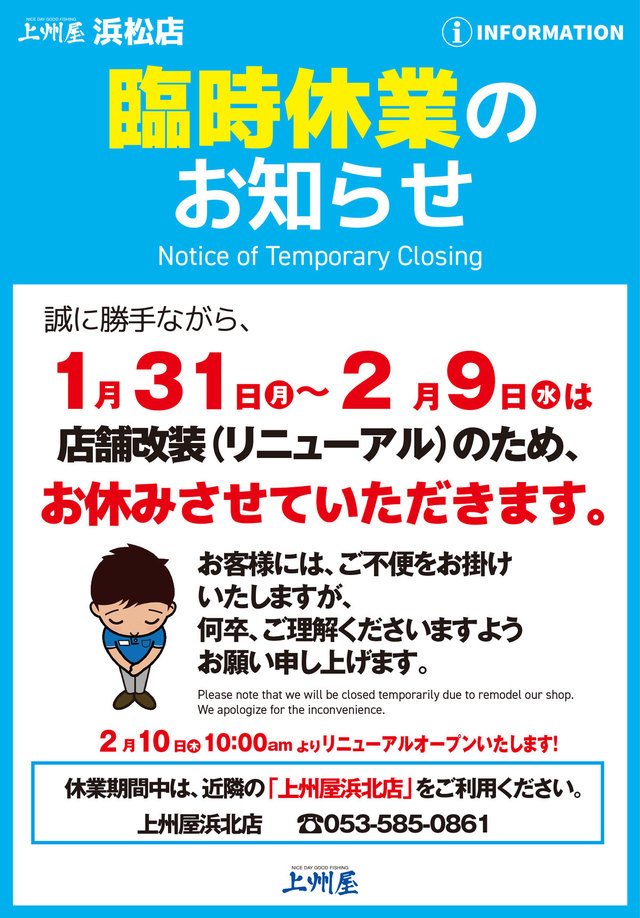 上州屋浜松店、店舗改装による1/31(月)~10日間臨時休業および2/10(木)リニューアルオープンのお知らせ。