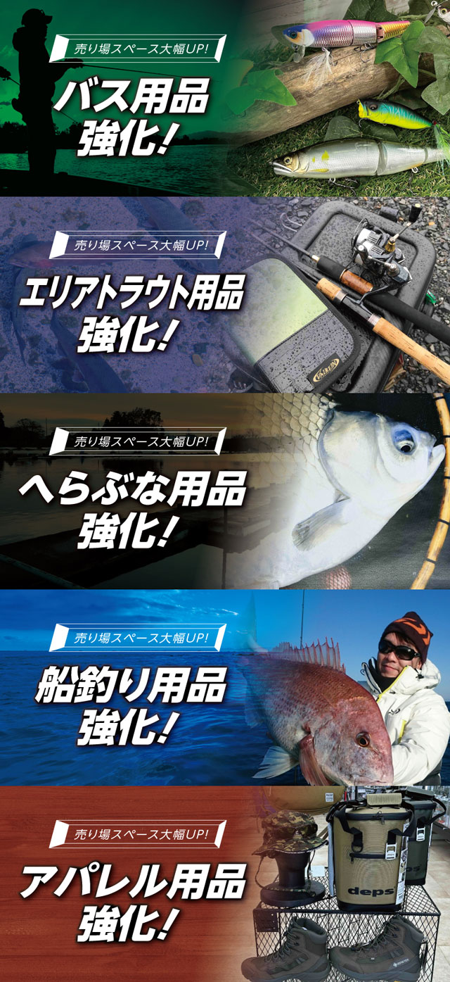 バス用品、エリアトラウト用品、へら鮒用品、船釣り用品、アパレル用品など売り場スペース大幅アップ!地域密着&充実の品揃えで北関東の釣りを応援いたします!