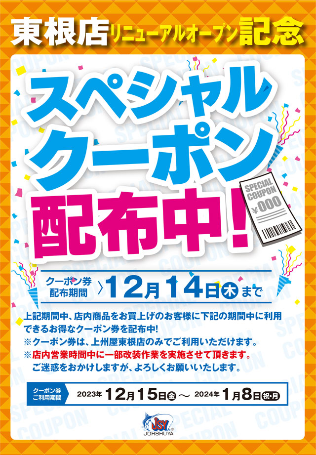 只今、上州屋東根店にて店内商品お買い上げのお客様に同店リニューアルオープン後(2023年12月15日~2024年1月8日)にご利用いただけるスペシャルクーポン配布中!