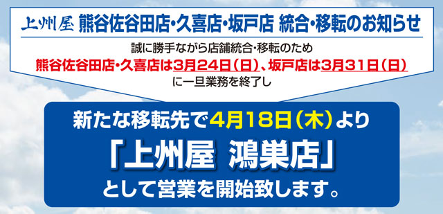上州屋熊谷佐谷田店、久喜店、坂戸店が統合移転!4/18(木)上州屋鴻巣店としてBIGにオープンします!