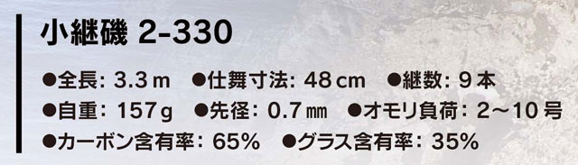 ●全長:3.3m ●仕舞寸法:48cm ●継数:9本 ●自重:157g ●先径:0.7mm ●オモリ負荷:2~10号 ●カーボン含有率:65% ●グラス含有率35%