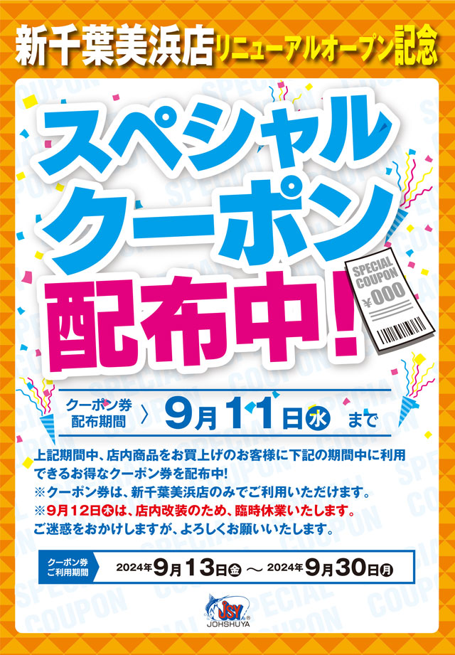 只今、上州屋新千葉美浜店にて店内商品お買い上げのお客様に同店リニューアルオープン後(9月13日~9月30日)にご利用いただけるスペシャルクーポン配布中!