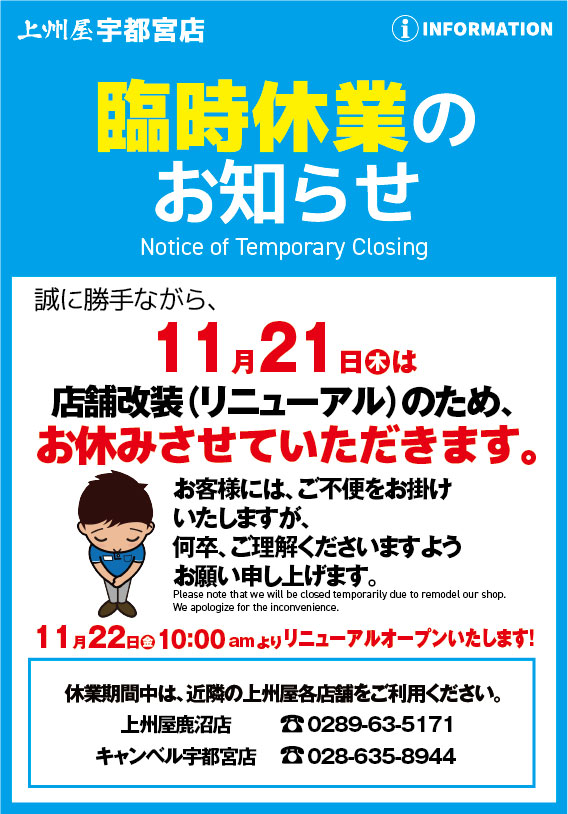 上州屋宇都宮店、店舗改装による11/21(木)臨時休業および11/22(金)リニューアルオープンのお知らせ。