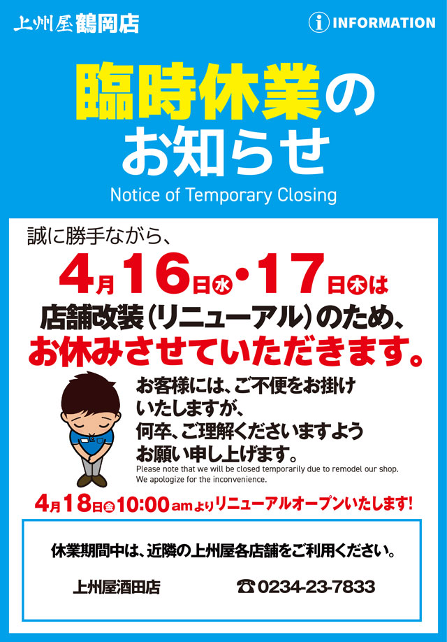 上州屋鶴岡店、店舗改装による4/16(水)~17(木)臨時休業および4/18(金)リニューアルオープンのお知らせ。