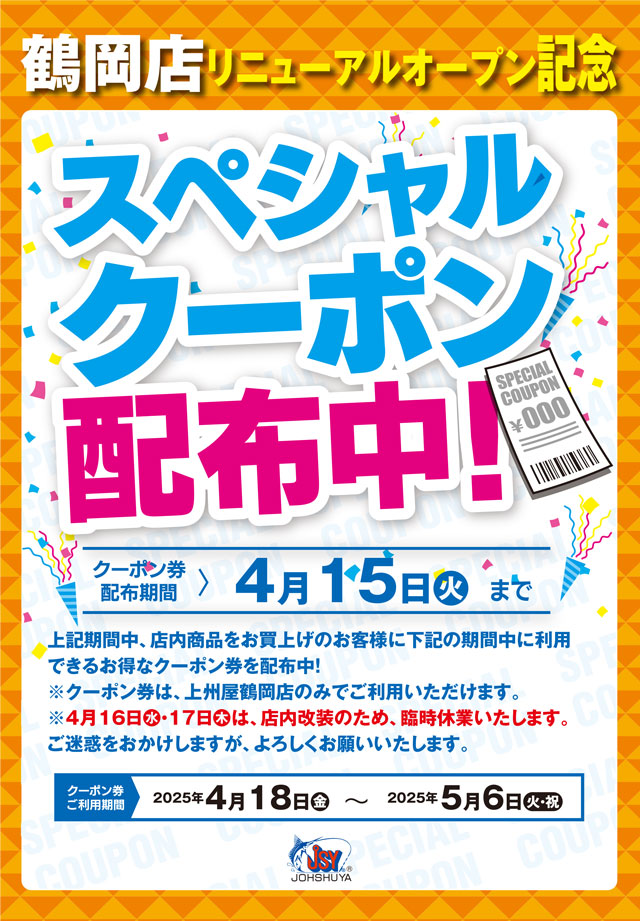 只今、上州屋鶴岡店では店内商品お買い上げのお客様に同店リニューアルオープン後(4月18日~5月6日)にご利用いただけるスペシャルクーポン配布中!