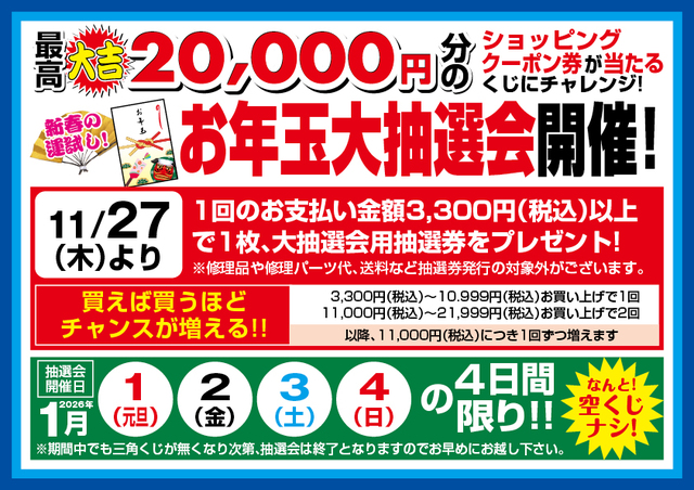 2026年1月1日(元旦)、2日(金)、3日()、4日(の4日間限定(※注)、最高『大吉』20,000円分のショッピングクーポン券が当たる“お年玉”大抽選会を開催します!なんと空クジなし!開催期間中、上記案内の抽選券をご持参、もしくは1回のお支払い金額3,300円(税込)以上でその場でチャレンジ!