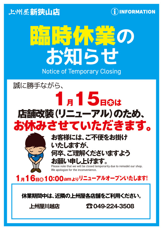 臨時休業中は何かとご不便をおかけしますが、近隣上州屋川越店など近隣店舗のご利用をお願い申し上げます。