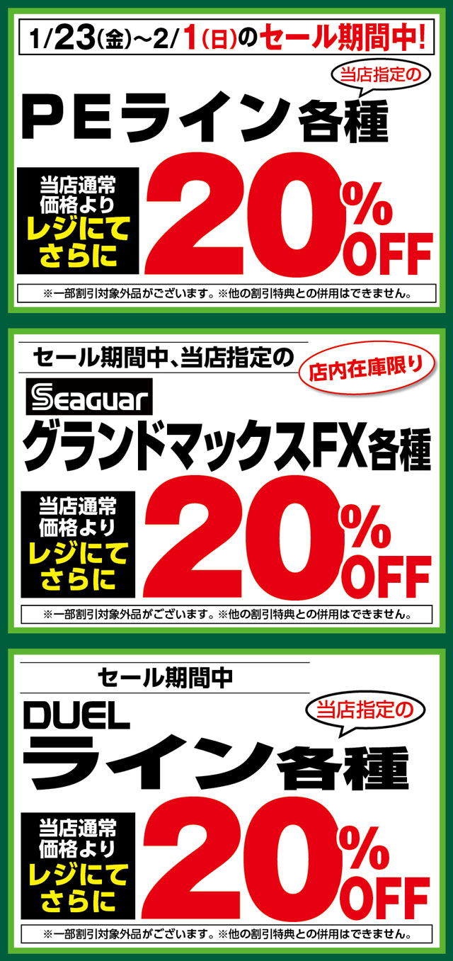 1月23日(金)からのセール期間中、当店指定の「PEライン各種」「シーガーグランドマックスFX各種」「DUELライン各種」が、店内在庫限り当店通常価格よりレジにてさらに20%OFF!