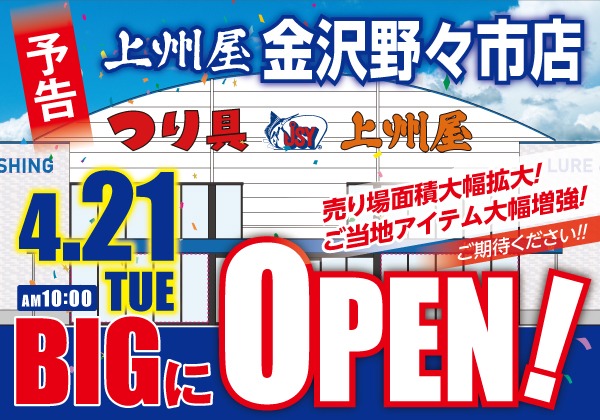 新たにオープンする上州屋金沢野々市店は、現店舗より売り場面積大幅拡大!ご当地アイテム大幅増強!さらに地域密着&充実の品揃えで皆様の釣りを応援します!