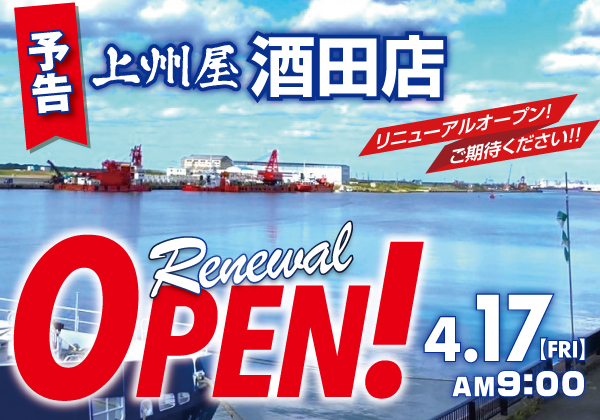 上州屋酒田店、店舗改装による4/15(水)~16(木)臨時休業および4/17(金)リニューアルオープンのお知らせ。