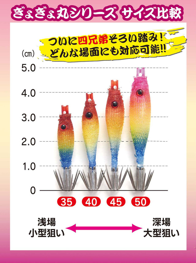 シリーズ最小!スレたマルイカに効く極小35サイズ、ぎょぎょ丸35(サンゴー、シンキング3.5cm)新登場!シリーズ初の「超極細針0.5mm6本立て」!神奈川方面上州屋各店(一部限定店)にて好評販売中!