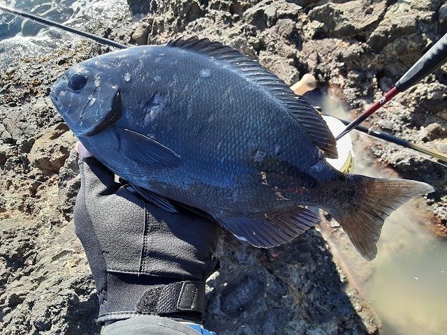 今期2回目の磯釣り釣行…2日目…南伊豆須崎沖磯へ、渡礁して潮の流れを見ると程よく磯際をかすめるいい感じの釣れそうな流れ、0ウキにノーガンで攻めるも上潮にウキが飛ばされている感じなので00ウキにチェンジしてストッパーの下へガン玉G5を1個付けるとウキのシモリ具合がベスト?な状態になり、寄せ餌と付けエサ(ウキ)のシモリ具合が同調すると中型のメジナ・イサキからダイレクトなライン引きのアタリが多数で磯竿を目一杯まげてのやり取りで昨日の鬱憤を晴らします。棚を下げすぎると歓迎しない他魚が多いので当日は竿1本前後をメインで攻めました。その後はメジナイサキ以外のお土産も欲しいので慣れないルアーロッドを片手にロックフィッシュ狙いへ、俗にいう直リグ(20g前後)にワームを付けてキャスト、海底ずる引きで強烈なひったくるアタリで釣れたのはお久しぶりの大型オオモンハタ45cm、その後もポツポツアタリがありアカハタ5匹キャッチ(小型はリリース)やってみると意外と楽しい高級魚ハタ狙いの磯ルアーオススメです!カンパチも食べたいのでメタルジグで狙いましたがこちらはアタリもありませんでした。