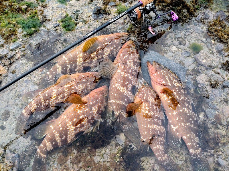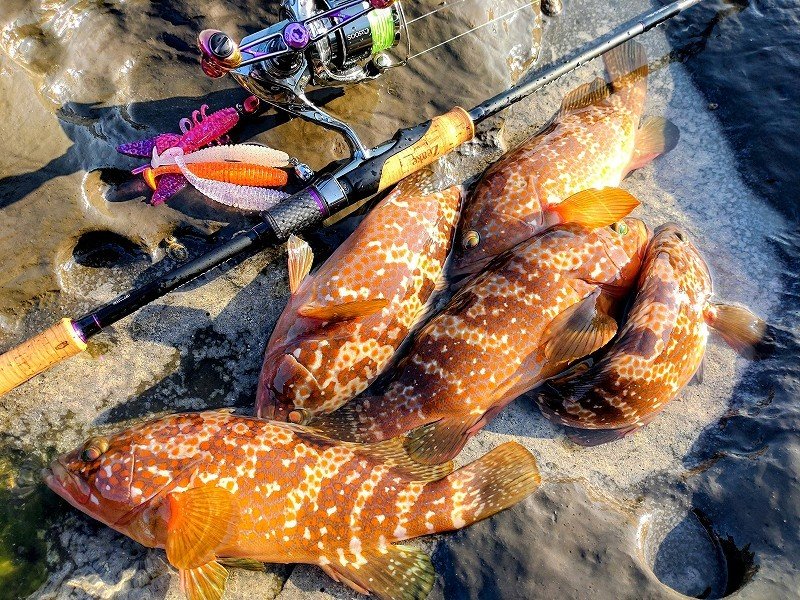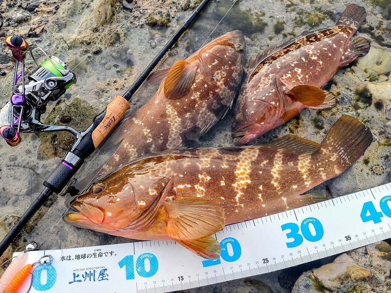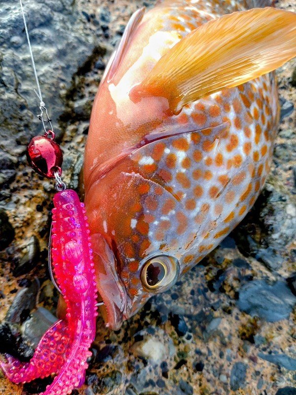 鶴岡店ルアー担当:跡邊です。11日はキジハタ&エギングへ行ってきました。朝一のキジハタはパッとせずエギングにシフトしますが追ってくるけど抱かず…サーチで寄せてライブ2号を投げるのが勝ち確パターンなのですが…無視!!むしろ逃げる!!結果…時速1杯…難しかった…飽きずに頑張りました。13日は出勤前の朝練キジハタ釣行へ!薄暗い時間帯にも関わらず無反応…。キャラメルシャッドのスイミングからジャコバグに変更しボトムのちょい上をフワフワさせるとヒット!!サイズは小さいながら釣り方がマッチしたのか連チャンモードに!!しかし…アタっても掛からなかったりランディング直後に外れたりと掛かりが浅く…良いの掛けましたが身切れで無念のバラし…。なかなかの重量感なだけに残念ですね…。エギングと兼用でライトタックルなのでサイズは30cm前後ですがスリリングなやり取りで最高に楽しめました!無謀なライトタックルと言われぬよう1.ハードブル+グランドマックス→対根ズレ最強の組み合わせ。2.出来るだけレンジを上げて掛ける→根ズレのリスク軽減。3.キジハタが根掛かりしても無理に引っ張らない→絶対出てくるので焦らず冷静にエギングタックルで楽しめる秋の釣り1タックルでアオリイカ、キジハタいろいろな魚種を狙ってみよう!!