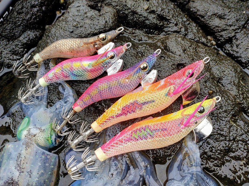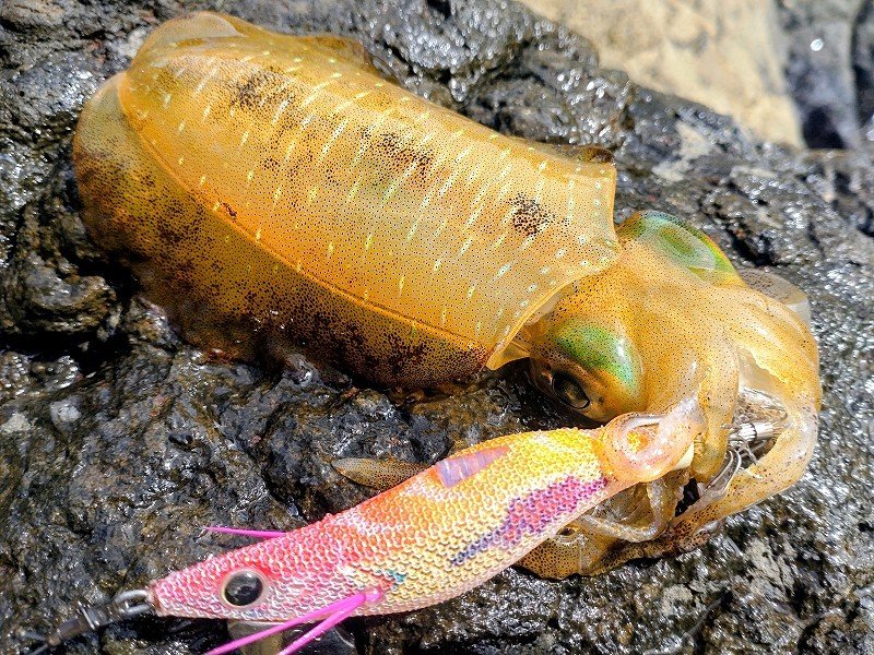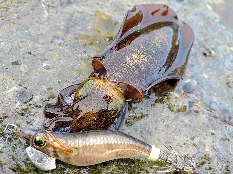 鶴岡店ルアー担当:跡邊です。最盛期を迎えるエギングへ行ってきました!29日は波高こそ無いもののウネリが酷く時折ドカーンっと来る波にビビりながらの釣りになり濁りは無く水色は◎数か所周りウネリを避けながらサーチでイカを探すと…ようやくチェイスが!!直ぐにライブ2号をキャストするとヒット!あれ?少し大きくなってる!?日に日に大きくなり成長しています。サーチで寄せてライブで抱かせる作戦でコンスタントに釣れたもののウミウの到来とともにパタッと止まり終了となりました。1日は出勤前の朝練釣行!イベント明けで本格的にエギングモードに切り替えるつもりが…気が付けばキジハタ釣ってました…。潮はスカスカでしたが光量変化がある時間帯で着ドンもあったりと活性は高く数は釣れるのですがサイズが伸びずレンジを上げても変わらずひたすらに数釣りを楽しみました。30cmに満たないサイズでしたがライトタックルだからこそ味わえる重量感でした!!山から太陽光が差すとアタリがピタリと止み終了しました。潮止まりも重なりイカ狙うもチェイスも無く…当日は日中の方が良さそうな潮でした。休みの人が羨ましい…。次回もマルチタックルでどちらの釣りも思い切り楽しみます!!