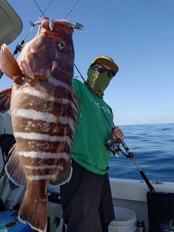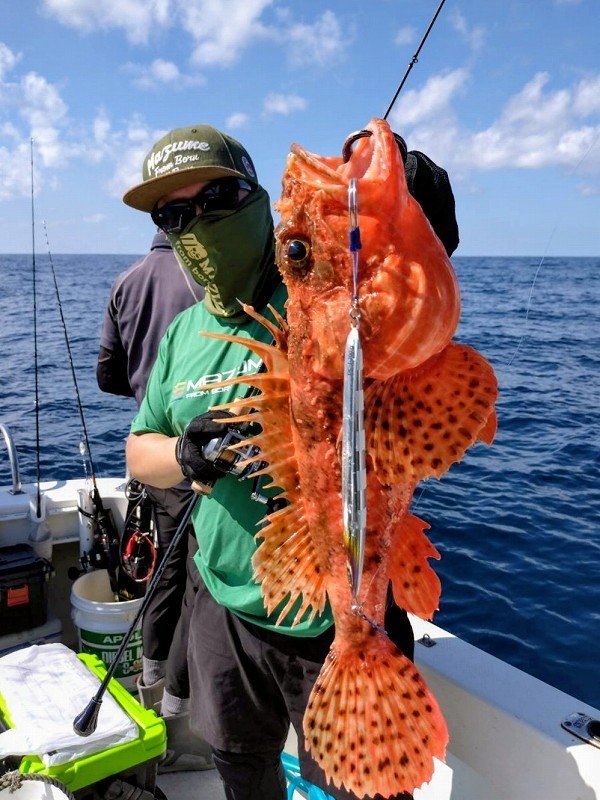 鶴岡店ルアー担当:跡邊です。今年から中深海スロージギング始めてみました。お世話になったのは酒田港【イザナミさん】中深海スロージギングはマニアックなイメージが強くアタリが少ない上にボウズが当たり前みたいな難しい釣りのイメージでしたが…いざ挑戦してみると意外と難しくないのかも!?思ったよりもアタリが多く本命の他にもソイ、ウスメバル、ムシガレイ、カツオ、スルメイカ、カガミダイ、オニカサゴなどたくさんの魚が釣れました!!たまに岩も!?今年はアラを釣りたくてチャレンジしたので狙うレンジはほぼボトムと難しい棚取りもありませんしシャクり上げないので腕が疲れず楽チンです!回収は大変ですが…。まだ始めて間もないのですが想像してた100倍楽しい釣りでした!!何よりも釣れる魚が全部美味い!!!タラの白子、カガミダイの肝、イカ焼き、ソイの湯上げ、カレイの一夜干し、カツオのタタキ、オニカサゴのから揚げ、毎日のようにご馳走でした。美味い!スロージギングおすすめですよ!狙う魚によって道具立て変わりますのでタックル、ジグ、フックセッティング等、是非ご相談くださいませ。次回はもう来年かな~?スタッフ:跡邊