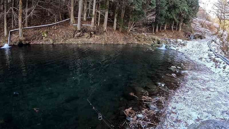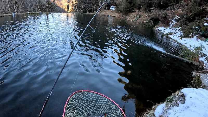 この日の朝は冷え込み、午前中は風も時折強く狙いの8号池は沈黙・・・・お昼まで8号池で粘りましたが釣果も芳しくなく、寒さに耐えかねて日が差している5号池へ移動。日が差している池は幾分、水温も上がっているのか魚の反応も良くポツポツ釣果も上がり一安心。最後は1号池でサイズ狙いを決め込みましたが大型ヒットも寄せきったところで暴れられラインブレイク・・・・がっがり・・・その後やや大きめをキャッチし終了しました。やはり人も、魚も冬の極寒時は日の当たった暖かいポイントが良いようでした。