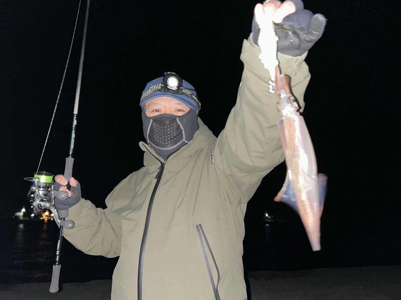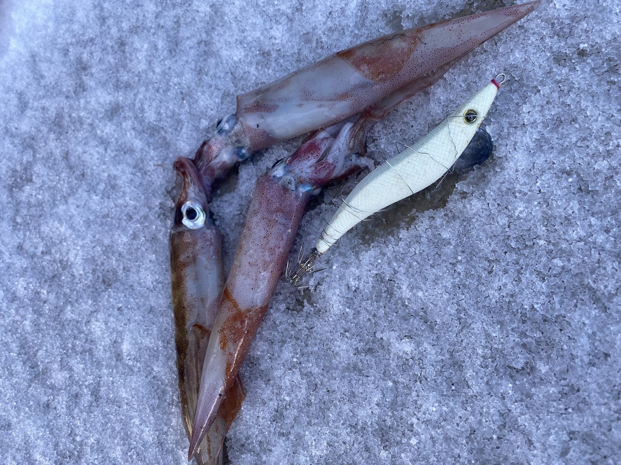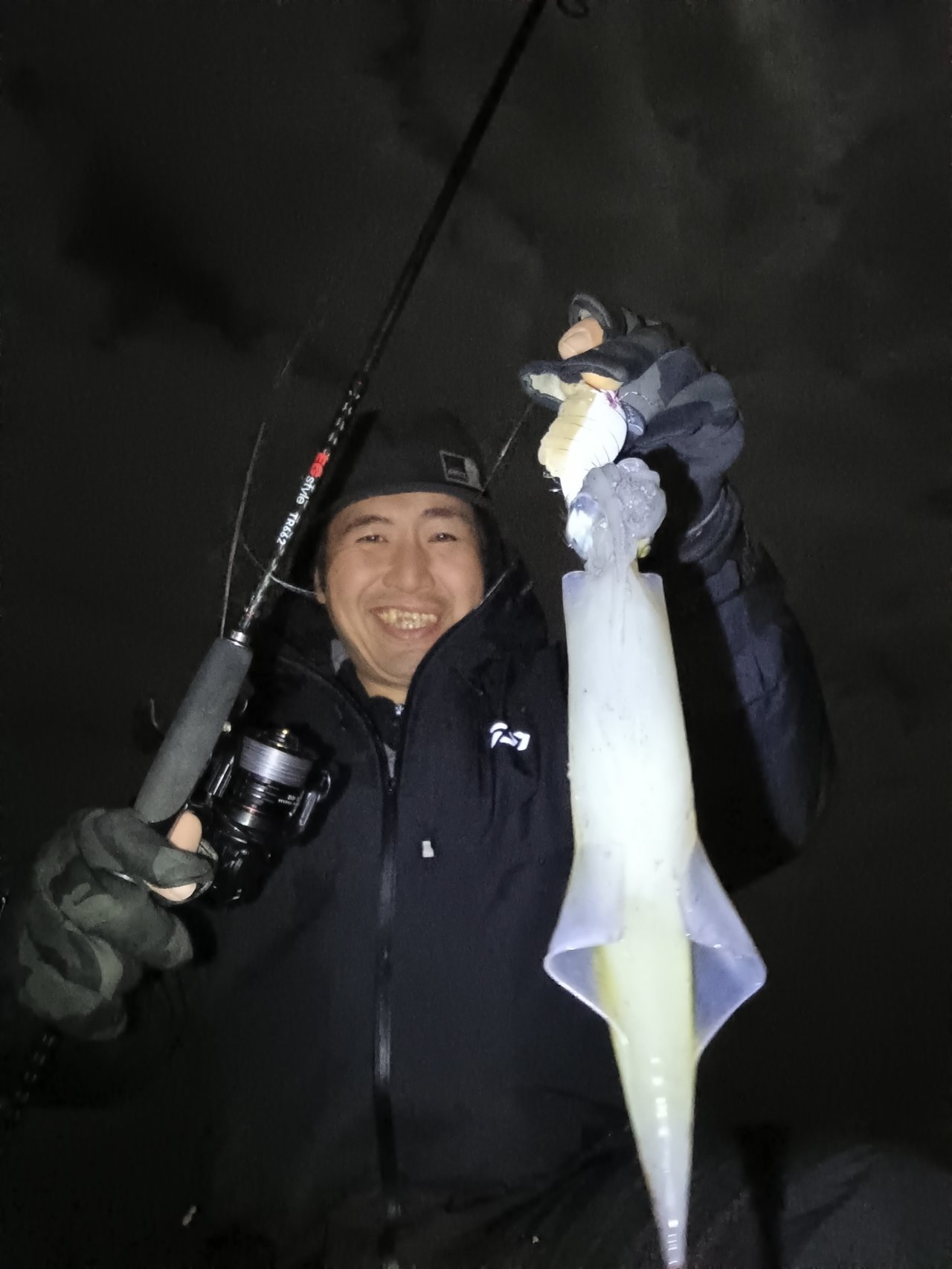 ポイントへ着くと雪がちらつき風も強いですが追い風。キーストンの餌巻きエギに餌はキビナゴをチョイス。手前を探ってみると1投目から早速のヤリイカゲット!小さいイカの群れなのかサイズは出ませんが同じサイズをポロポロと拾い釣りすることができました。その後キビナゴに付け替えたスタッフ片岡もヤリイカキャッチ!沖に投げて沈めているとスタッフ美濃崎もサイズアップしますがいかんせんキビナゴは餌持ちが悪く、きれいな状態のエサの方が喰いは良い状況。スタッフ片岡は餌持ち重視で塩ささみに付け替え何杯かバラしながらも釣り続けていきます。結局日付が変わるまで続けてヤリイカ12杯+スルメイカ1杯を手にして納竿終了となりました。