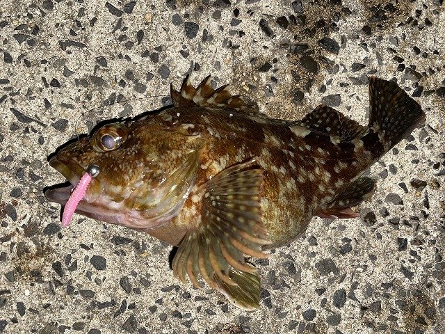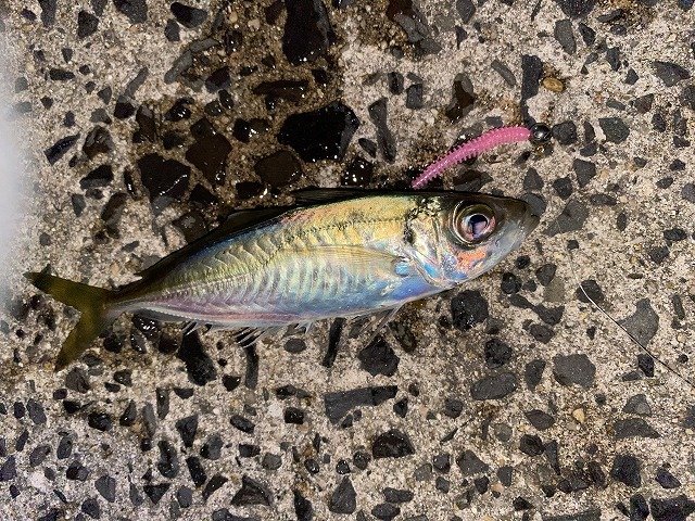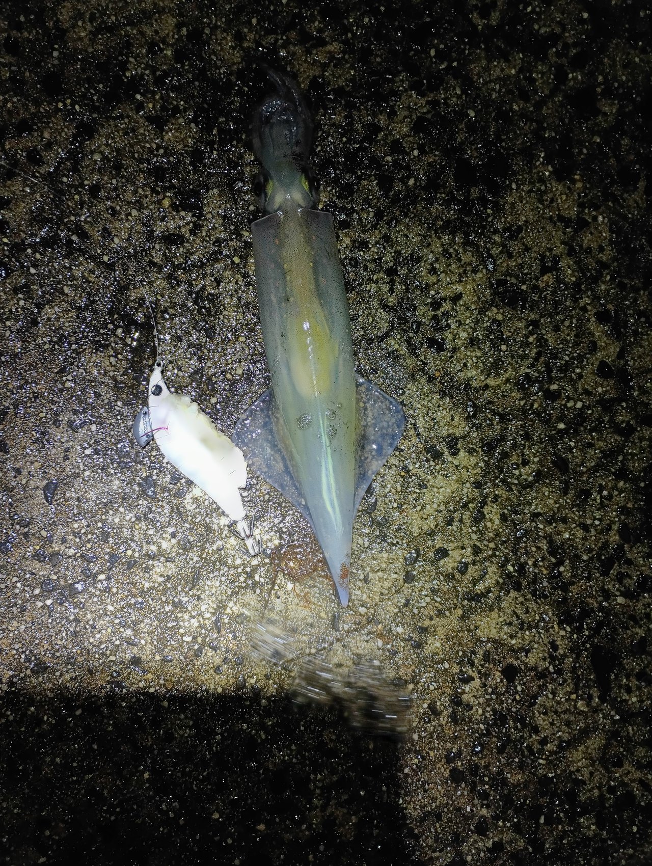 到着してみると先行者様1組。すでに1杯釣られたそうで期待を持って開始。今回はエサ巻きエギ、エサは塩ささみをチョイス。開始しばらくは反応がありませんが我慢して続けていると念願のアタリが、、しかしながら硬質な魚からのアタリ、、気を取り直してしゃくってステイさせると明らかにイカのアタリ!あわせますが乗せ損じそのままカーブフォールさせると再度アタリ&再度空振り、、、投げ直してアタリ→空振り→アタリ→空振りをもう一度繰り返し、、、次の1投げにもアタリが出て空振りしダメかと思いましたが次のアタリにはしっかりと乗ってくれて初イカを無事ゲットする事ができました!しかしながらイカの時合は短いモノ、反応がなくなり風も強くなったのでヤリイカ釣りは納竿終了。