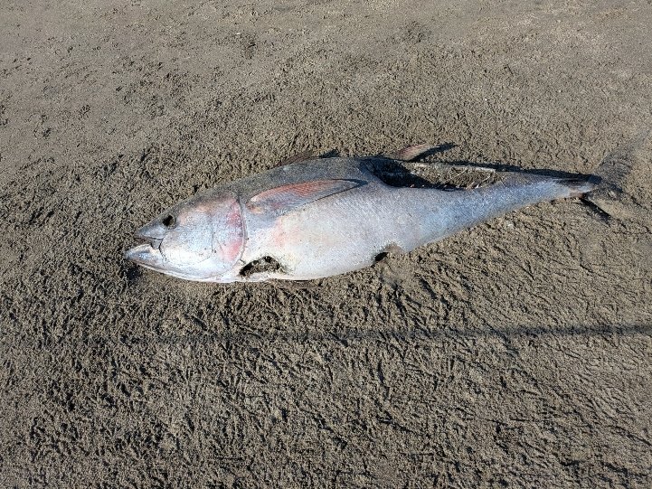 ヒラメ狙いで仙台サーフに行って来ました。今日も9時に到着。ゆっくりのスタートです。最初は波、風共に穏やかだったのでシンペンで手前のブレイクを探りましたが反応無し。10時頃から段々風が強くなり、波も高くなって来たのでメタルジグに変更。ボトム~1mのレンジを意識しながら引いて来ると「ガツン!」やはり沖ではなく、40~50mラインでヒットしました。サイズは45cmと前回より少しサイズアップしました。また、「砂浜にカラスが群がる何か」が有ったので近寄って見てみると2m近いマグロでした。