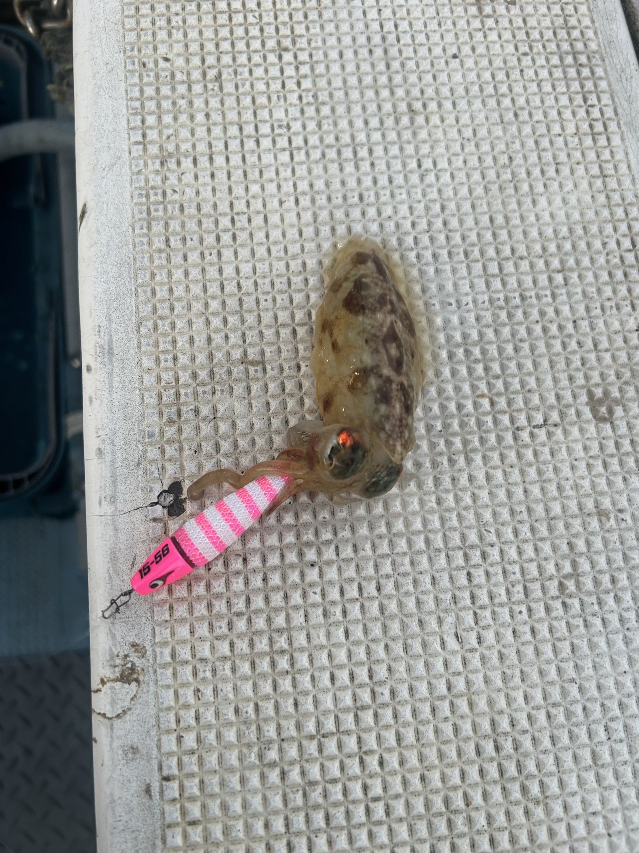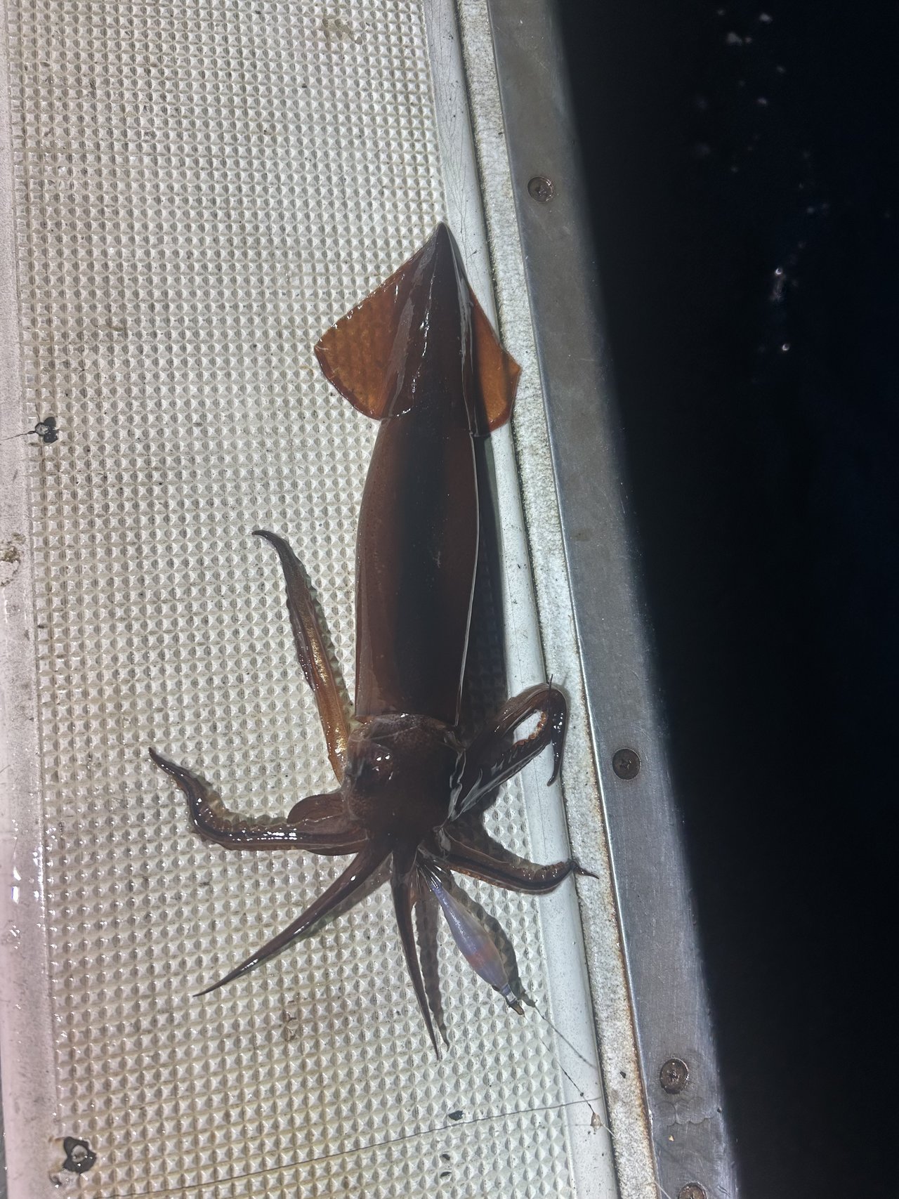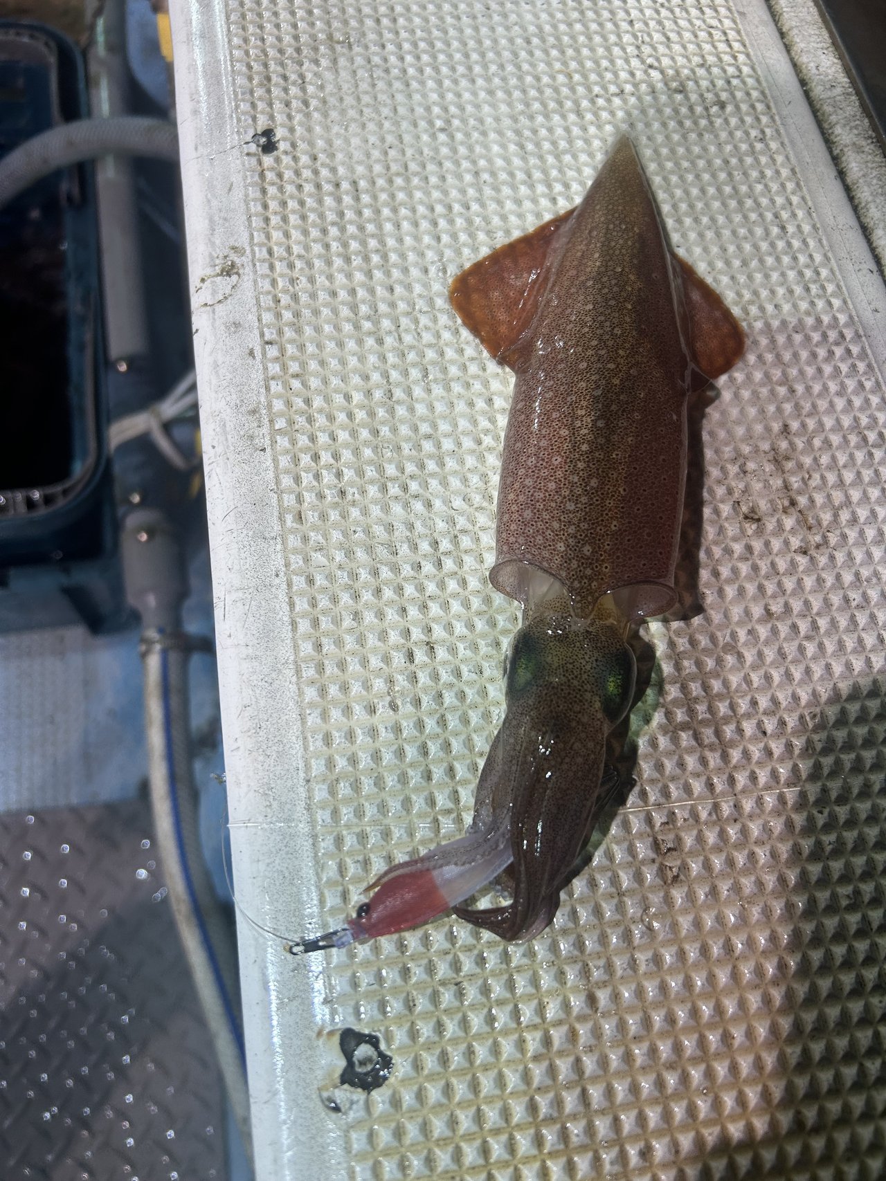 し釣り開始。多少風がありましたが潮も緩くまずはイカメタル15号でスタートしました。ヤリイカ狙いで底を取り1投目でアタリが!幸先がイイと思いきや、メタルと同じ大きさのコウイカ・・・?気を取り直し釣りを再開、暗くなるにつれアタリが多くなりぽつぽつですが、ヤリイカ18~22㎝位とスルメイカ30㎝台が釣れてくれました。ほとんど底での釣果でしたので明日は筋肉痛の予感!次回の釣行では、もっと成長したヤリイカが見れそうです。
