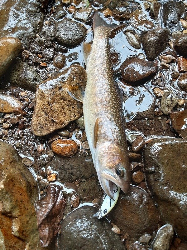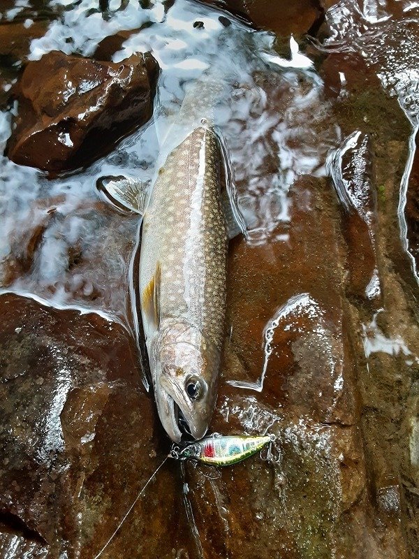 予定していた最初の砂防堰堤の落ち込みでもののふ45Sにてイワナをキャッチ。