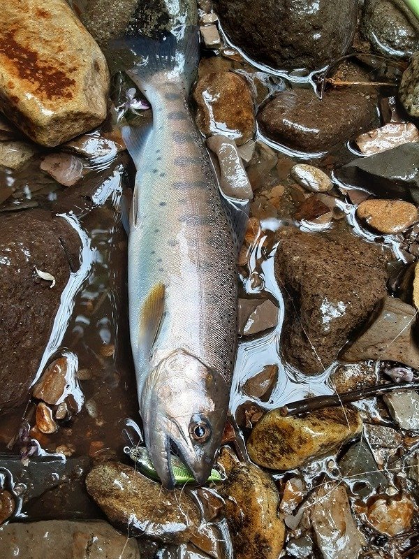 前回好反応だった中上橋前後に入渓。本命の本流の流れでは反応は無く分流の浅い流れで2匹キャッチして終了です。10月31(金)まで楽しめます。日釣¥1500