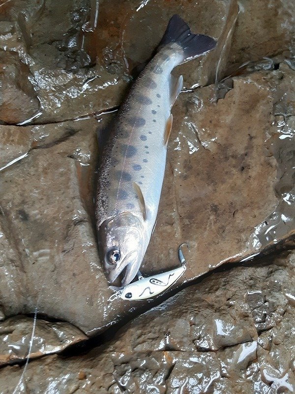すると、良型サイズのヤマメがHIT.しばらく白イナゴで楽しめました。