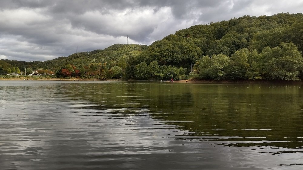 風が横から吹いてます。湖面が波立ってます。釣りになっていないもようです。
