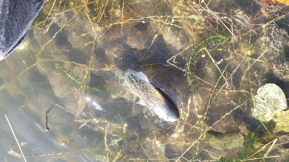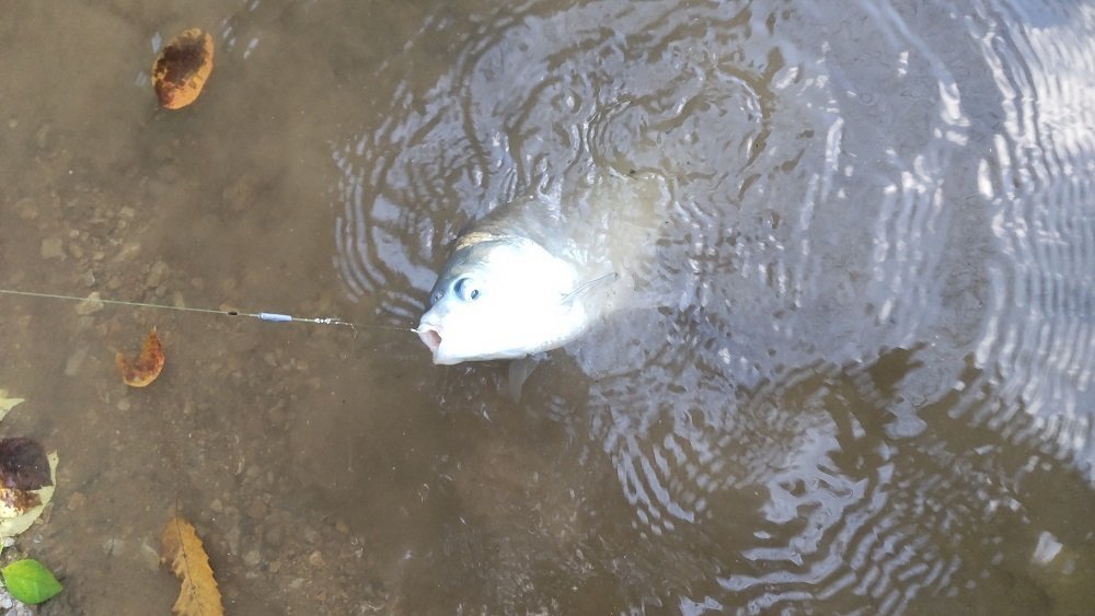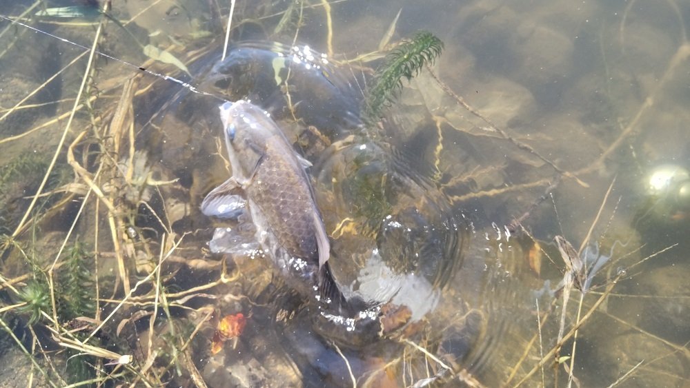 その後なんの反応も得られないまま仕掛けを回収すると連チャンで魚が引っ掛かって(スレて)きました。しかも手前。魚がいるのが分かりあの手この手で口を使わそうとしますが全然ア・タ・ラ・ナ・イ\(^_^)/