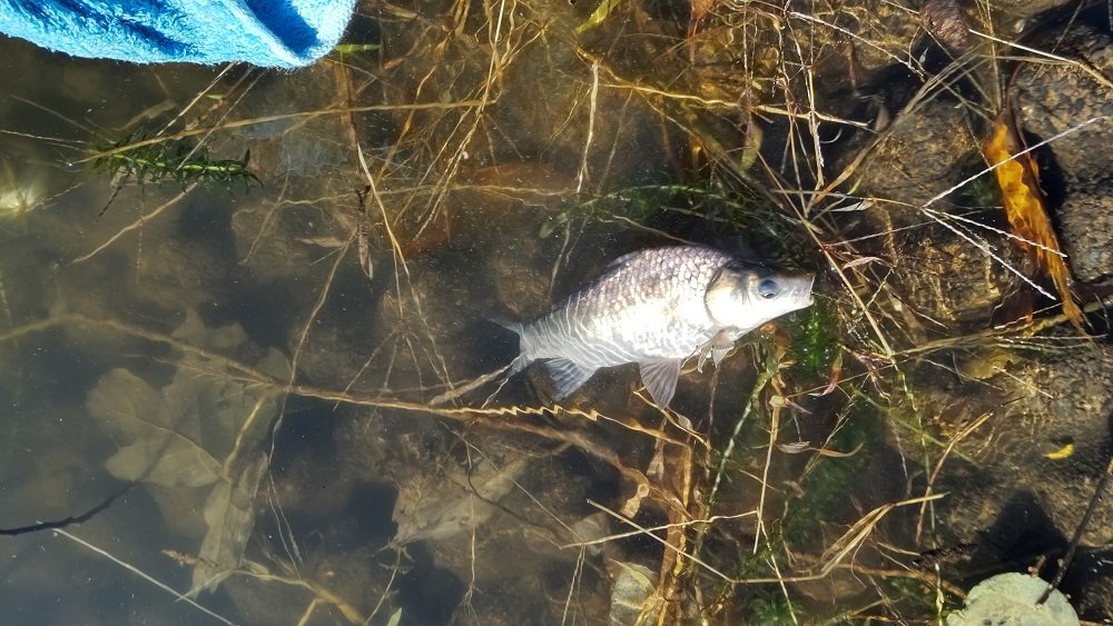 それでも二人はメゲズに竿を出し続けたのですが...たけお。に不幸が舞い降ります。まずアワセた瞬間に道糸が切れウキごと持って行かれ動揺したのかそのタイミングでスマホは池ポチャするわ、仕掛けバッグ池ポチャするわ、偏光グラス池ポチャ....(´;ω;`)ウゥゥ