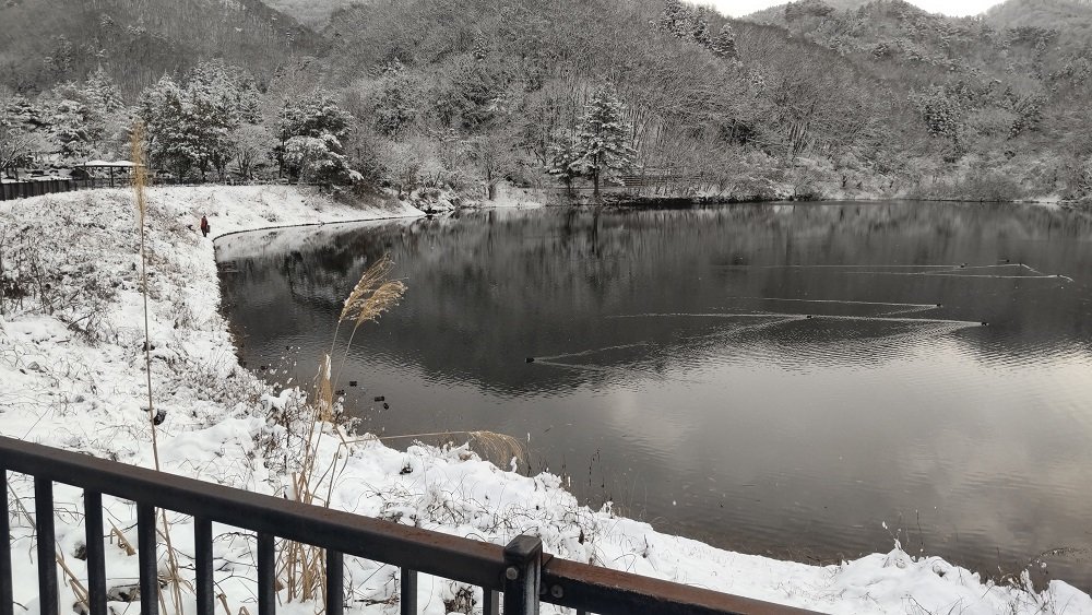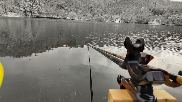 当日はガッツリ雪模様につき計4名の釣り人。池への到着は10時頃。例年とは違い水量が満水に近く出っ張りにはすでに二人釣り座を構えていて入座できない状態ですが堰堤はほとんど空いてます笑