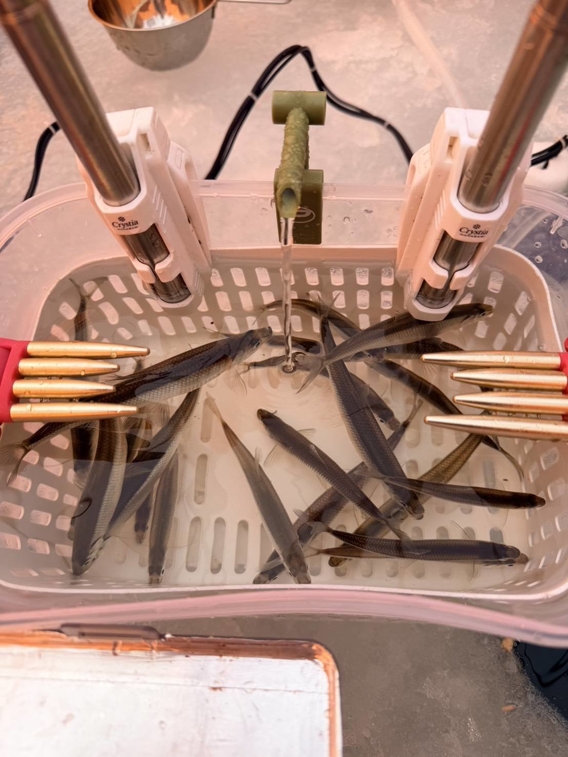 ■竿:クリーク「Dコブラ」 ■リール:クリスティアCRS外部電源(改) ■ライン:PE0.2号 ■仕掛け:上州屋オリジナルピンクエディション他 ■エサ:紅サシ&ブドウ虫