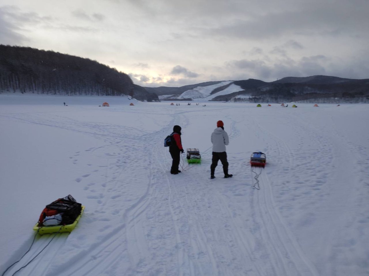 前回(3年前?)は湖面へとエントリーする際、重いソリを引いて長い坂を上り下りしたのですが、今季は水量が多く湖面全体が上がっているので、坂の距離が短く、上り下りがとても楽チンでした。