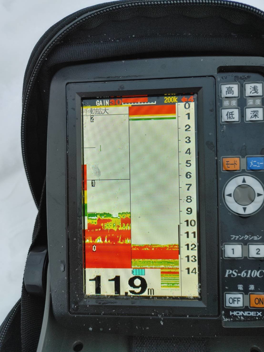 キャンプ場駐車場に車を停め、緩い坂を下り湖面へとエントリーし、穴をほじほじ魚探入れ入れでポイントを探していると、水深10mの場所でナイスな穴を発見!
