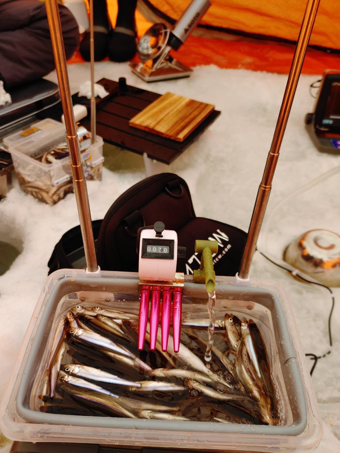 みんなで手早くテントを立てて早々に仕掛けを入れてみると、魚探の反応を裏切らないグッドなアタリがビシバシあり、エサを変える時間も惜しいモード突入で、次々に水槽の中にワカサギを送り込みます。