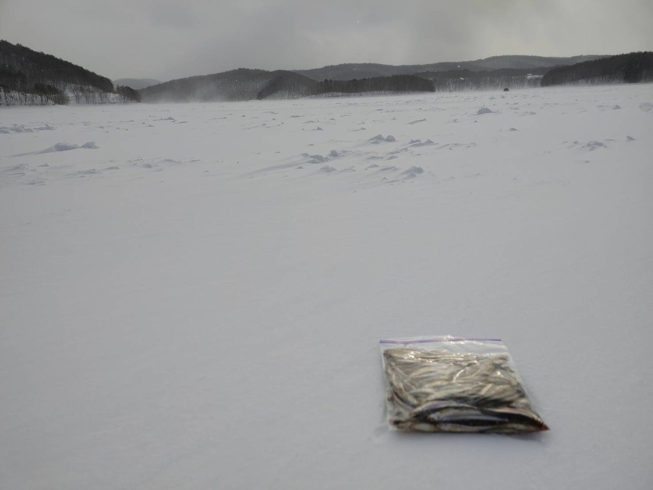 仕掛けを変え、オモリを変え、誘いを変え、エサを変え、試行錯誤のエンドレスループで気付けばもうお昼時。不穏な流れを変えようとレストハウスの「ホルモンうどん」(←コレ本当めっちゃ美味しい)と「手作りおにぎり」を食べて第2ラウンドへ挑みますが、午後からは魚影も少なくなり、風雪も強くなってきたので2時にて終了。