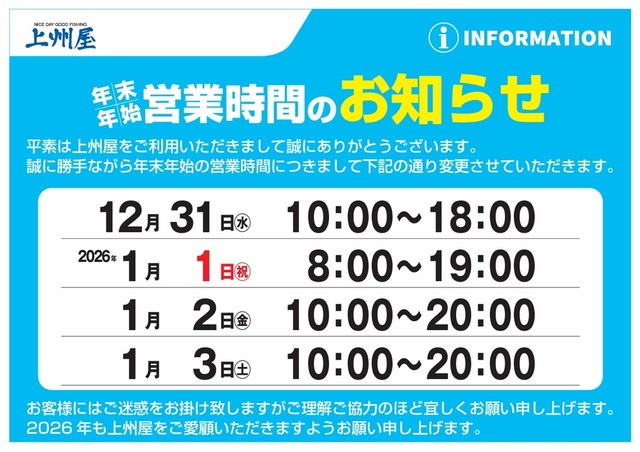 本年も上州屋新石巻店をご愛顧頂き誠にありがとうございました。