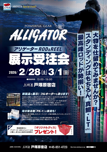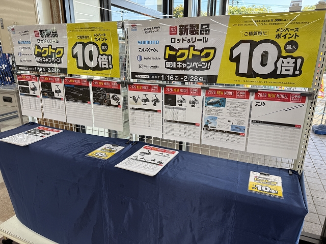 2026年2月5日その他・お知らせ お得なキャンペーンを開催中! 「新製品ロッド・リール トクトク受注会」キャンペーン開催中! 出典: ★1月16日(金)~2月28日(土)の期間中 新製品のロッド&リールをご注文頂きますと上州屋メンバーズカードポイントが最大10倍!! 上州屋からのお知らせ ・会員証機能を搭載!お買い物や釣りの準備がもっと便利になる上州屋“公式”アプリ登場!・【上州屋メンバーズカード】毎月5の付く日と30日(5日、15日、25日、30日)はポイントアップデー!