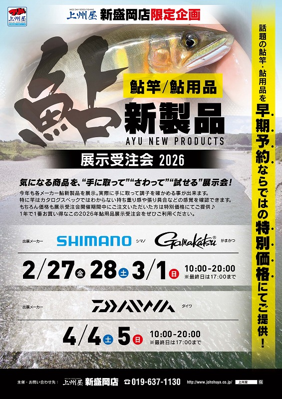 2026年1月9日その他・お知らせ 2026鮎カタログ入荷しております! 2026年のシマノ・オーナー・がまかつの【鮎/渓流カタログ】が入荷しております。無くなり次第配布終了となりますのでお早目にご来店ください。 今年の新製品情報が載っておりますので、じっくりとご覧になってご購入のご検討をお願いいたします! また、今年も【上州屋新盛岡店】にて鮎展示受注会を開催予定です。詳しい日程等は決まり次第またお知らせいたします。 上州屋からのお知らせ ・会員証機能を搭載!お買い物や釣りの準備がもっと便利になる上州屋“公式”アプリ登場!・【上州屋メンバーズカード】毎月5の付く日と30日(5日、15日、25日、30日)はポイントアップデー!