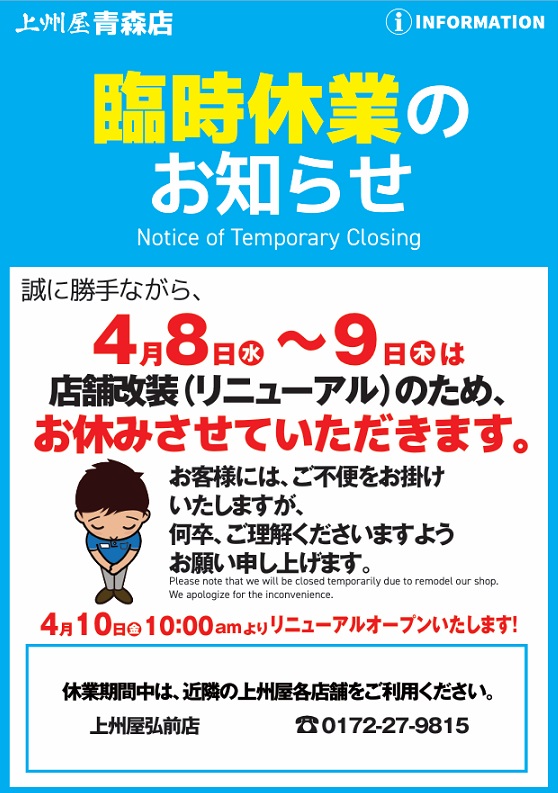 2026年4月8日その他・お知らせ 上州屋青森店 リニューアルオープンのお知らせ リニューアルオープンまで、青森店HP・上州屋アプリ・インスタ等にて、情報更新していきますのでお楽しみに! 青森店ホームページ 青森店インスタグラム 4月10日 10:00からOPENです😀ご期待ください! 出典: 上州屋からのお知らせ ・会員証機能を搭載!お買い物や釣りの準備がもっと便利になる上州屋“公式”アプリ登場!・【上州屋メンバーズカード】毎月5の付く日と30日(5日、15日、25日、30日)はポイントアップデー!